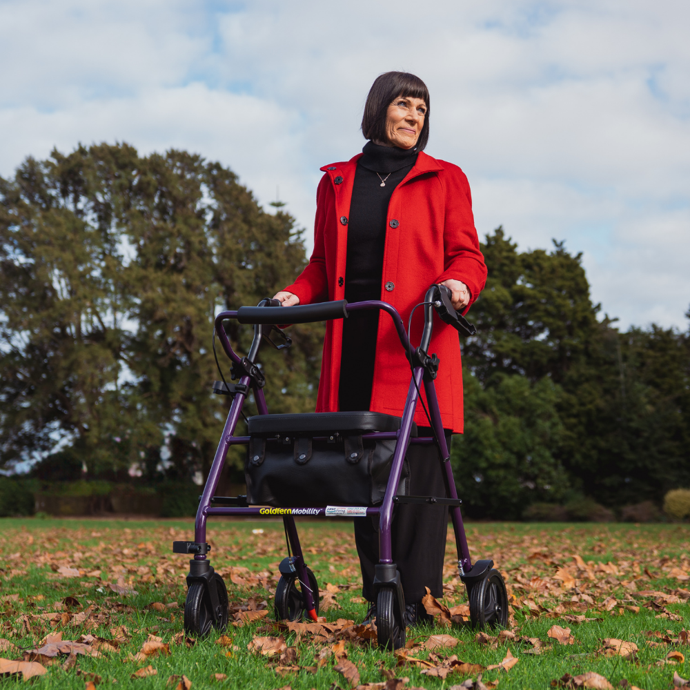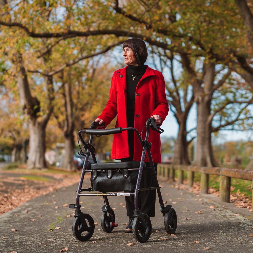The Ecolite is a lightweight alluminium rollator fully assembled for use.  Height adjustable soft compound ergonomic handles.  Has a curved folding backrest to fit around the back with foam padding for additional comfort.