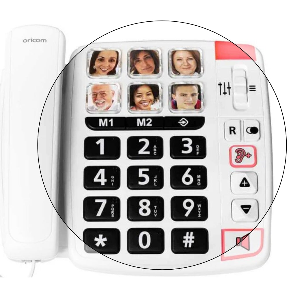 Big Button Amplified Phone with Picture Dialling. Oricom Care80S is an excellent amplified corded telephone with large picture dialling keys (including Braille dots) and great sound quality. With a visual ring indicator that flashes red when you have an incoming call.