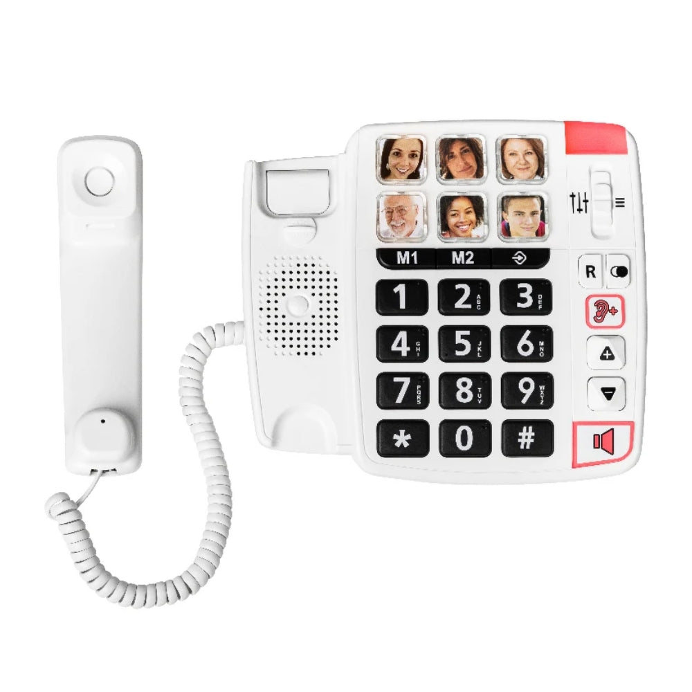 Pin the 6 photo buttons with your relatives' pictures to instantly call them in the easiest way. In addition, the phone is fitted with 2 direct memory keys. The ideal phone for persons suffering from memory loss, moderate to severe hearing loss and or low vision.